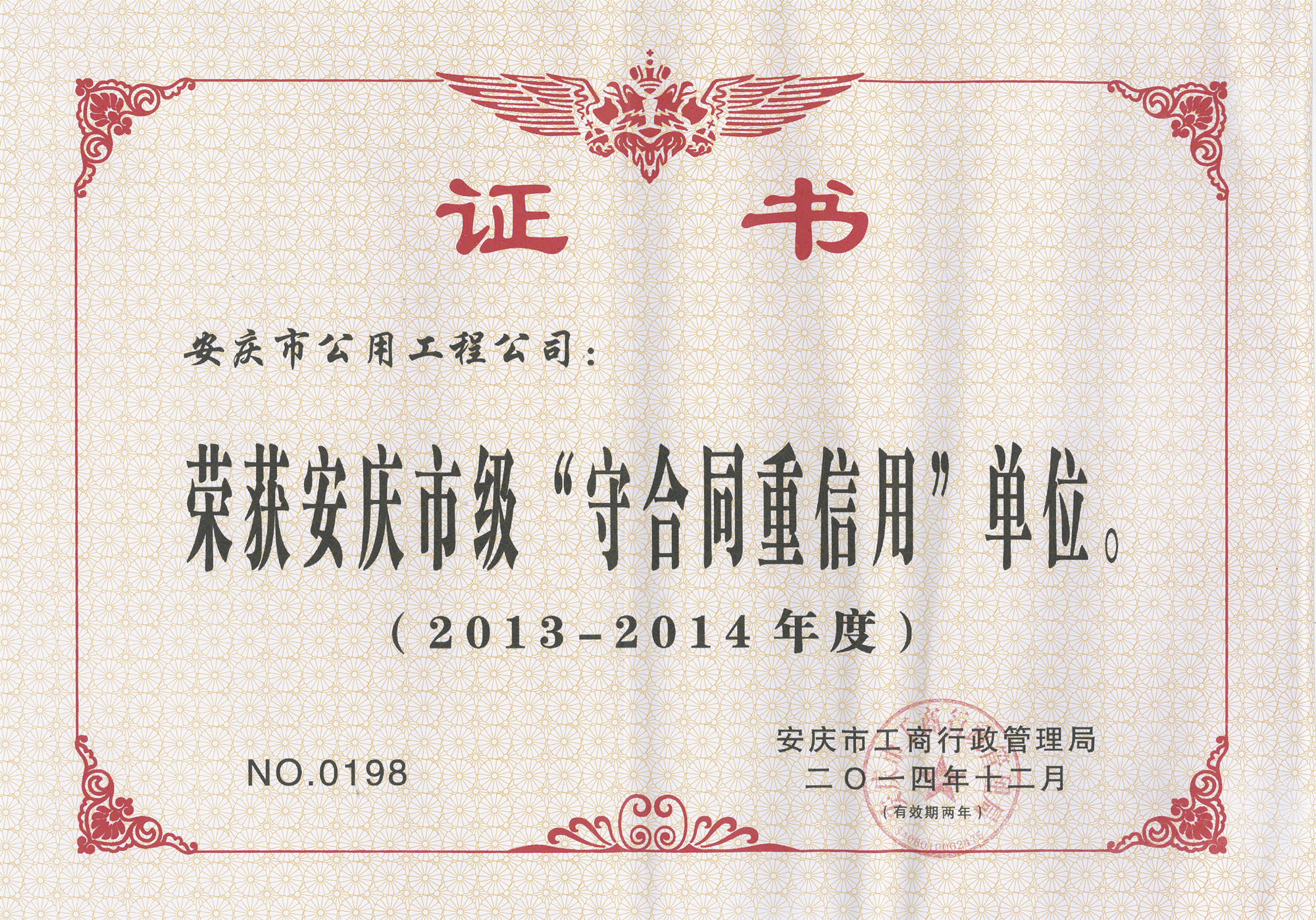 守合同重信用先進單位證書